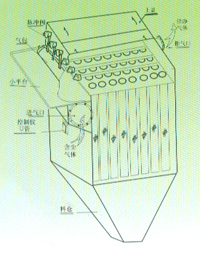 含塵氣體由上部進風口進入氣箱,通過導流擋板均襯的分布在過濾元件上,在過濾元件的作用下,粉塵被吸附在過濾元件的表面,潔凈的氣體通過出口管道排出,吸附在過濾元件表面的粉塵,利用脈沖電磁閥在控制儀的控制下(控制儀可根據(jù)實際工況進行設定),對過濾元件輪流進行清灰。因過濾元件為垂直安裝,所以能達到良好的清灰效果,以保證除塵器的正常工作。
